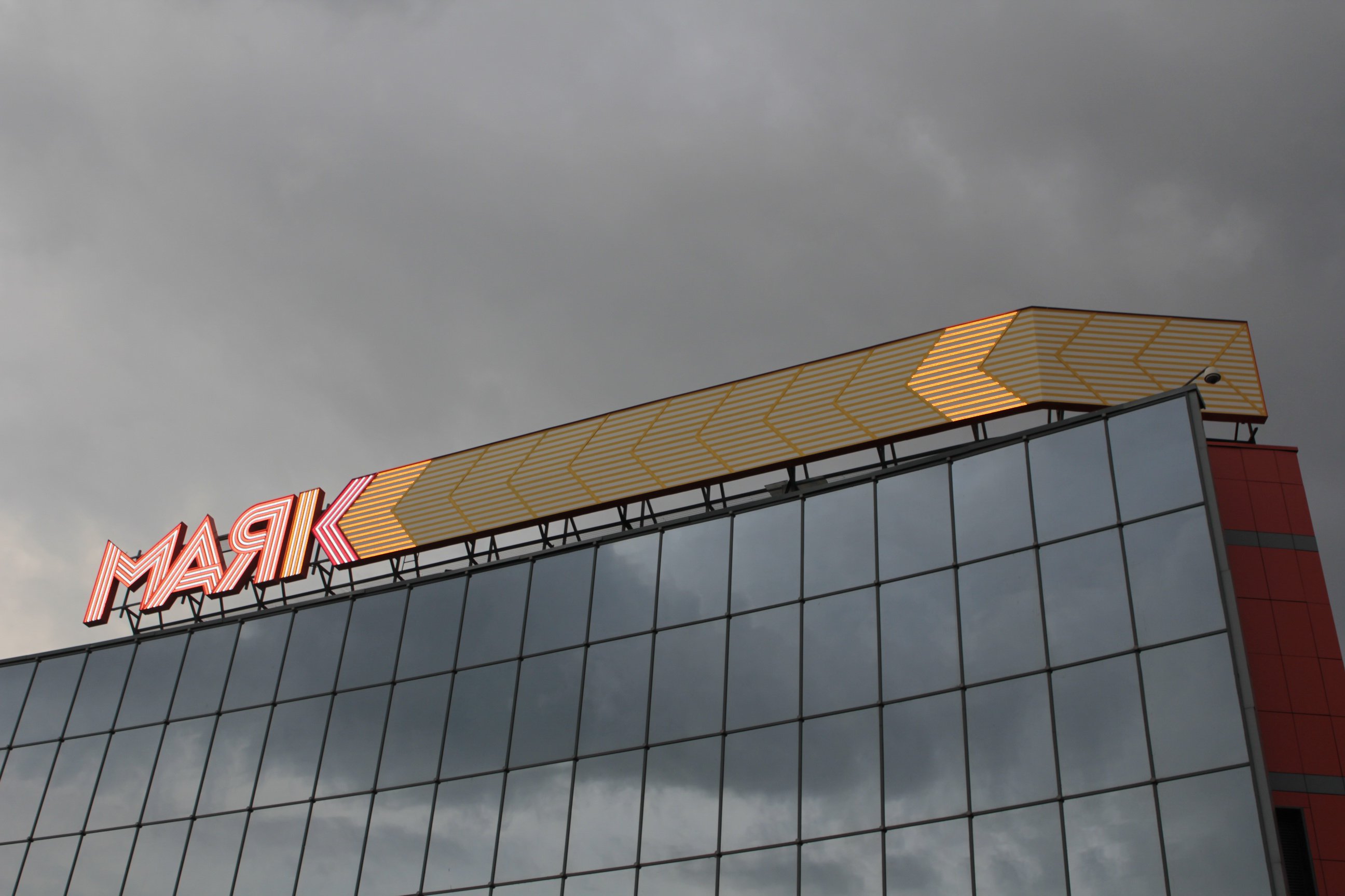 Две крышные вывески ТЦ МАЯК. Высота букв и стрелки 2400мм, длина крышных установок около 25м. Вывески выполнены с динамическими эффектами на стрелке. Эффект пробегания стрелки постоянно меняется по заданной программе. Подсветка выполнена открытыми светодиодными пикселями. Обе крышные вывески были изготовлении и смонтированы за 25 рабочих дней!!!